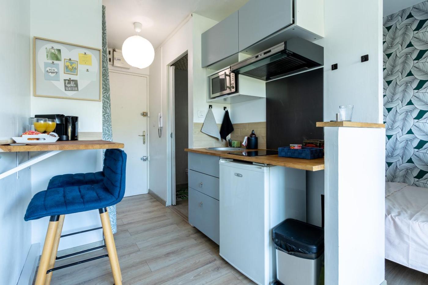 Appartement 1 Chambre. Featuring a private entrance, this apartment is comprised of 1 living room, 1 separate bedroom and 1 bathroom with a bath or a shower and a hairdryer. The apartments kitchenette, which features a refrigerator and a microwave, is available for cooking and storing food. Boasting a balcony, this apartment also offers a coffee machine, heating and a flat-screen TV. The unit offers 2 beds.