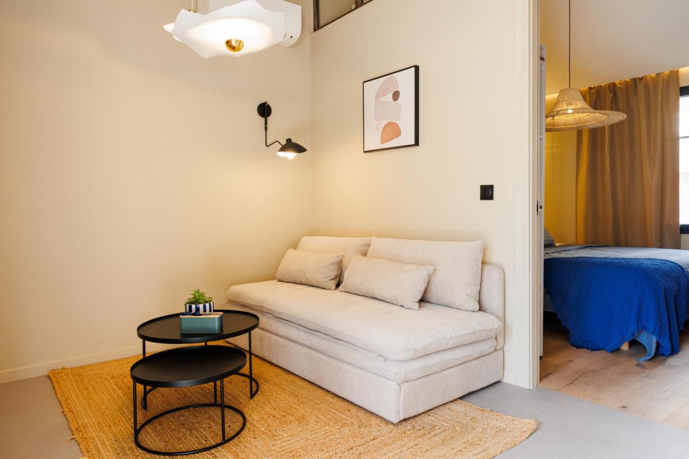 Cet appartement comporte 1 chambre, une télévision à écran plat, la climatisation et un salon.