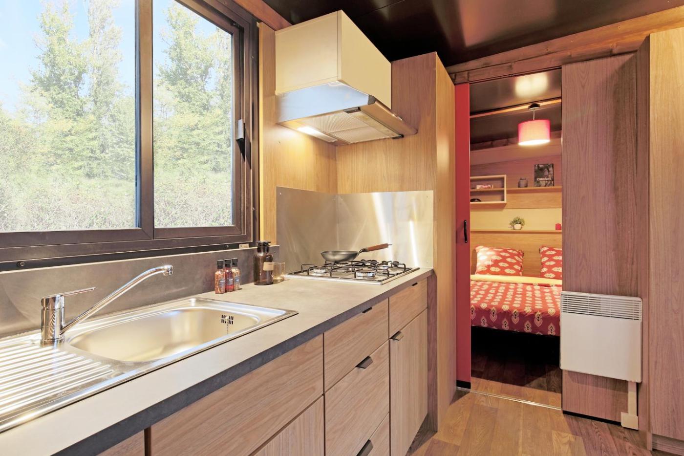 Mobile Home 2 Chambres - Ohara. Construit en 2017, ce mobile home climatisé dispose dune chambre double avec dressing, dune chambre dotée de lits superposés, ainsi que dune salle de bains pourvue d’une douche, d’un sèche-cheveux et de toilettes séparées. La cuisine est équipée dune cuisinière à gaz, dun micro-ondes, dun réfrigérateur-congélateur, dune cafetière électrique, de vaisselle et dune télévision. Le coin salon comporte un canapé-lit et une table à manger. Vous pourrez également prendre vos repas sur la terrasse couverte. Veuillez noter que le linge de lit n’est pas fourni. ;