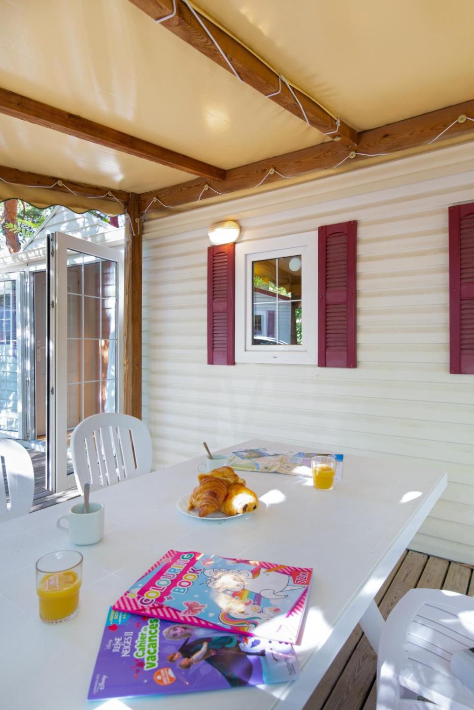 Mobile Home 2 Chambres Supérieur. This air-conditioned mobile home comes with 1 living room, 2 separate bedrooms and 1 bathroom with a shower. The well-fitted kitchen has a stovetop, a refrigerator, kitchenware and a microwave. Boasting a terrace, this mobile home also features a coffee machine, a seating area and a flat-screen TV. The unit has 4 beds. ;
